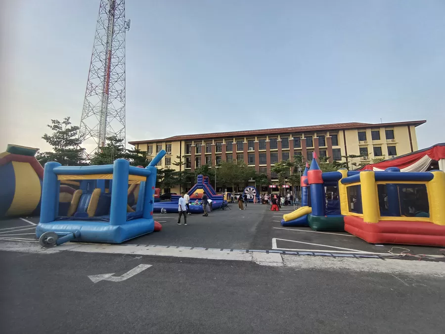 Berbagai jenis permainan berdiri di area parkir depan GSG Polda Lampung, mulai dari trampolin, istana balon, human claw, hingga handboat.