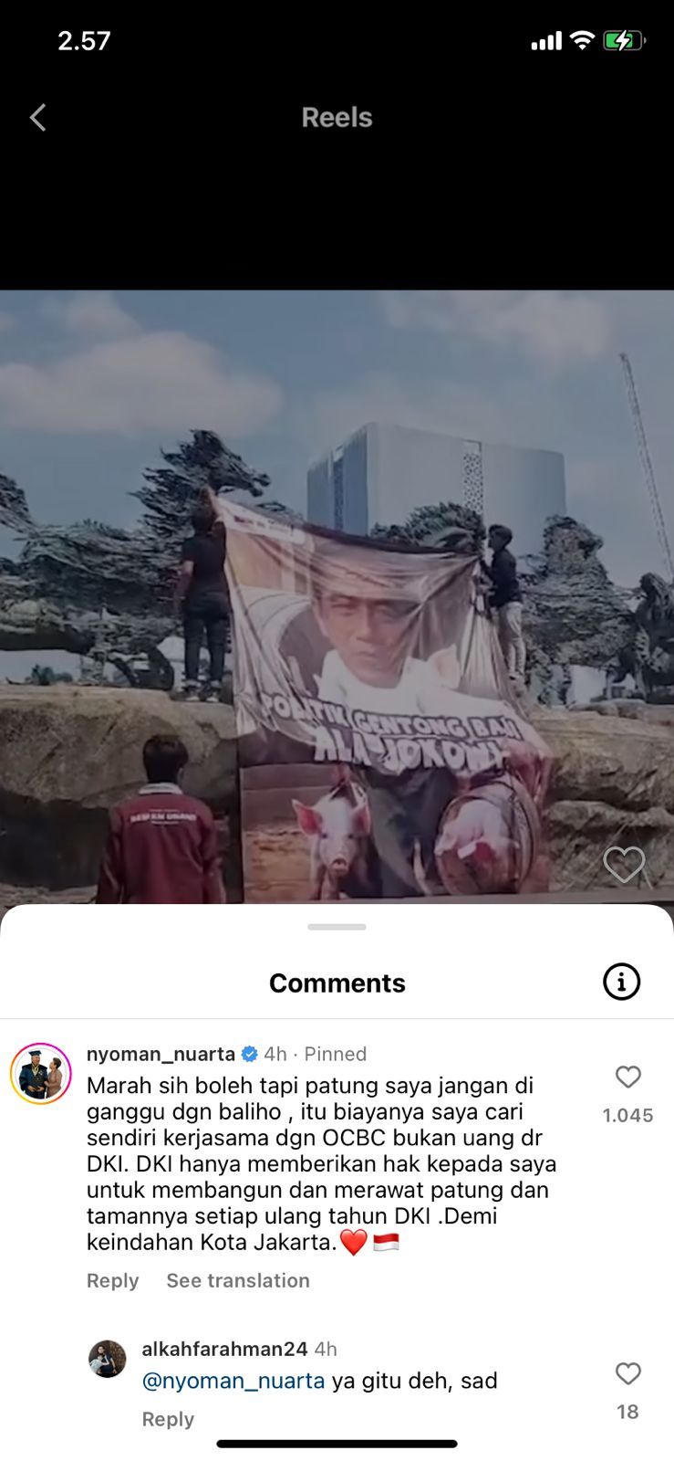 Akun @nyoman_nuarta berkomentar, "Marah sih boleh tapi patung saya jangan diganggu dengan baliho, itu biayanya saya cari sendiri kerja sama dengan OCBC bukan uang dari DKI. DKI hanya memberikan hak kepada saya untuk membangun dan merawat patung dan tamannya setiap ulang tahun DKI. Demi keindahan kota Jakarta."