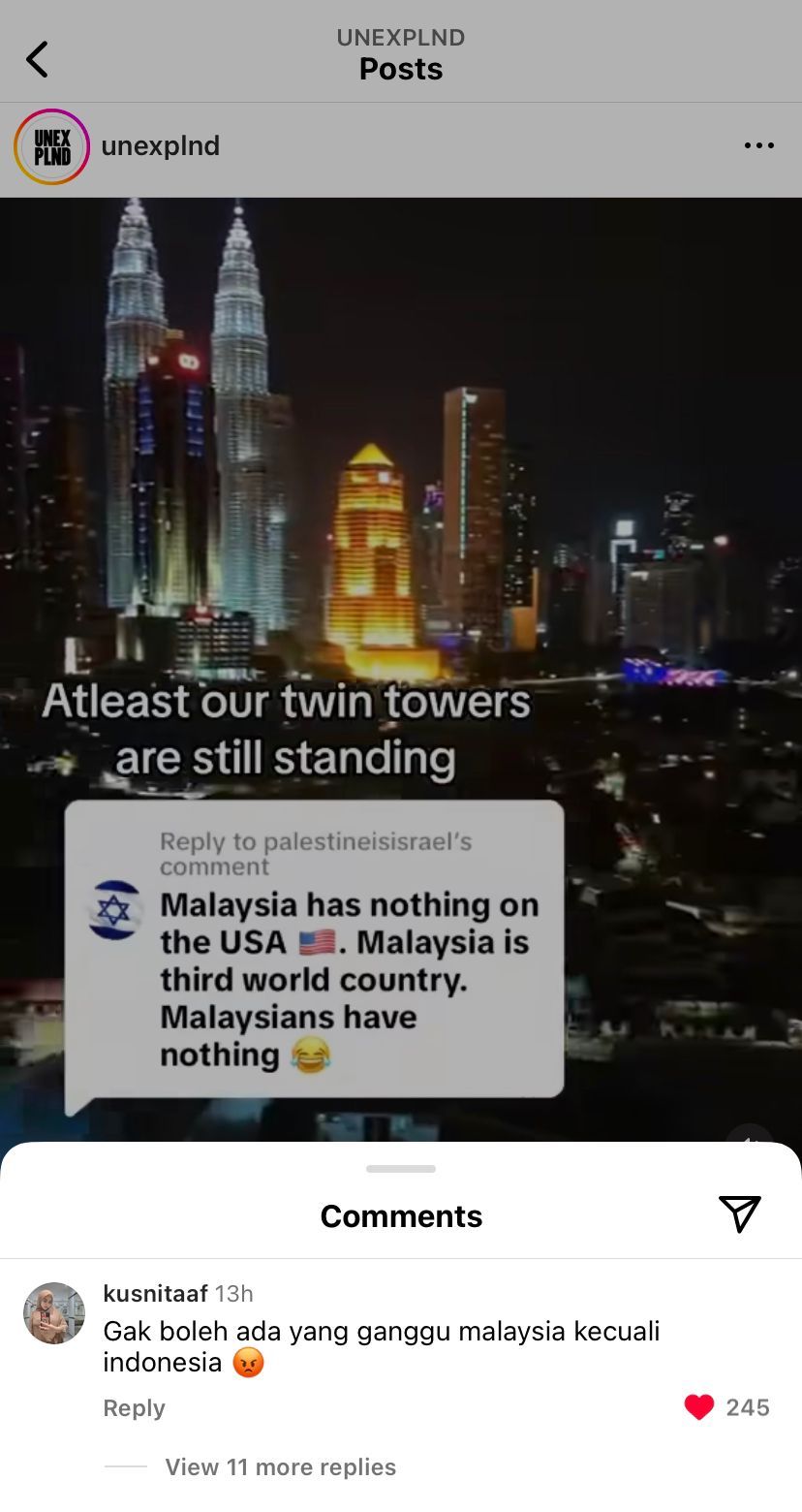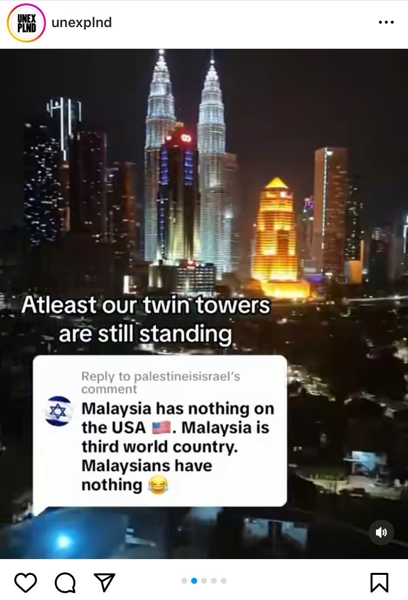 Netizen yang diduga berasal dari Israel tersebut memiliki akun TikTok dengan nama @palestineisisrael, dan meninggalkan komentar merendahkan Malaysia dengan mengatakan, "Malaysia tidak ada apa-apanya dibandingkan dengan Amerika Serikat. Malaysia adalah negara dunia ketiga. Rakyat Malaysia tidak memiliki apa-apa."